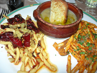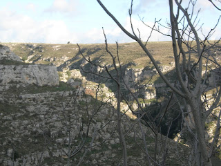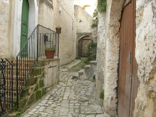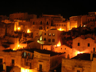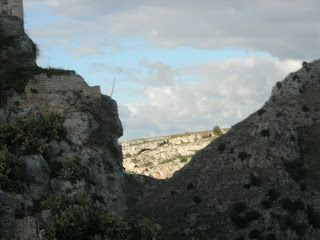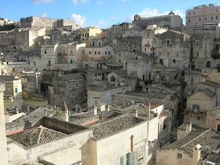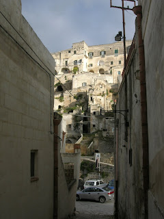 Sassi means Rock. I read somewhere that the Sassi is the oldest, most continuously inhabited city on Earth. It goes back to the stone age. There is a deep ravine/canyon that borders the town called the Gravina, with a river beneath it. Along the sides were many caves which were inhabited by paliolithic man. Long after that, in the 6th century AD, some monks and followers of St Basilius (hence, Basilicata?) fled the Turks and others who had banned represntation of holy images and came to the Sassi to live meditative and communal lives. They created churches within caves, and those churches have very beautiful byzantine images.