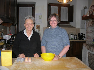 Once she dropped something and said "Signor Beneditto" under her breath. (Mr. Saint Benedict?) When she was done rolling it out, we filled it with apples (which I did help peel), and a pear… and she rolled it up together. Finally she says. " Questa e il partito molto difficule" and she crosses herself and puts her hand in prayer. "Signor Christo, mi aiuta per favore" (Jesus please help me). We also made an orzo soup and a yummy casserole with riced potatoes layered with cheese and prosciutto… I had to have second helpings on that. MMMM.